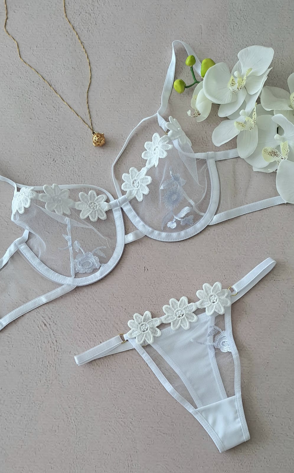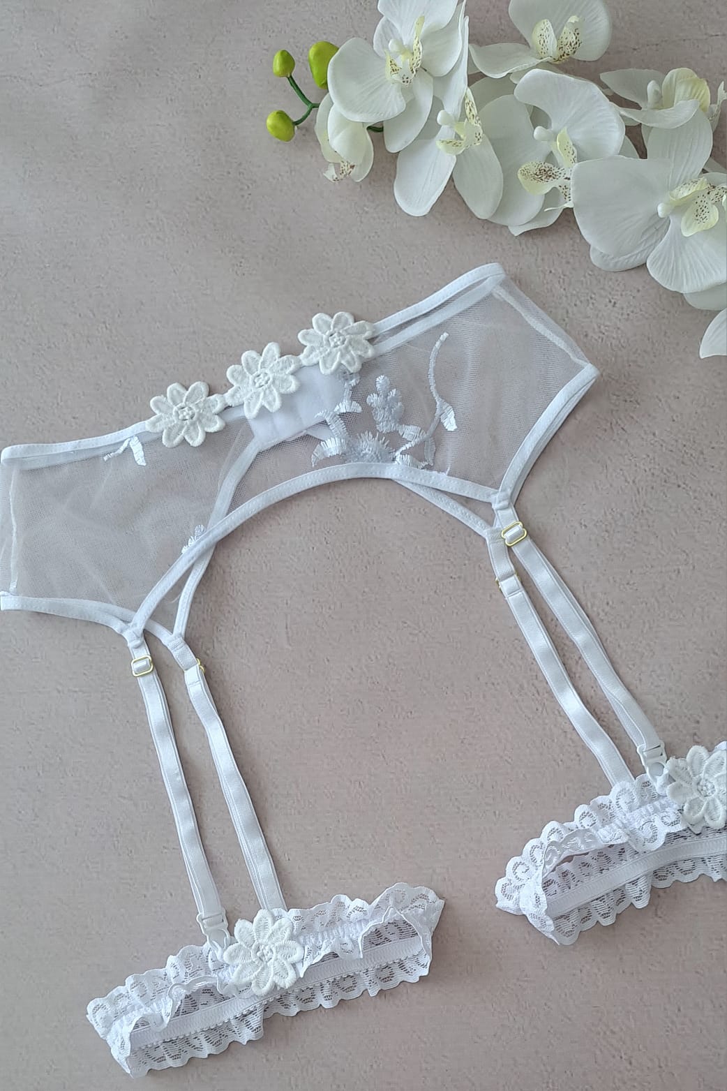 Elaborado en Tull rígido color blanco con delicados apliques en relieve de algodón en forma de flor. El diseño se complementa también en el liguero y el panty. Su horma es estándar, traen aro y espalda ajustable al igual que el panty.