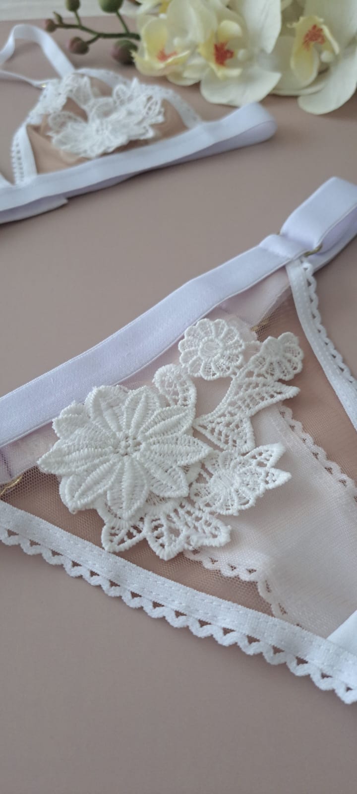 El encanto de este conjunto viene de sus delicadas flores en relieve en algodón y su toque de transparencia. Top sin aro con broche en espalda con 3 niveles para ajustar. Panty tipo Brasilera graduable.
