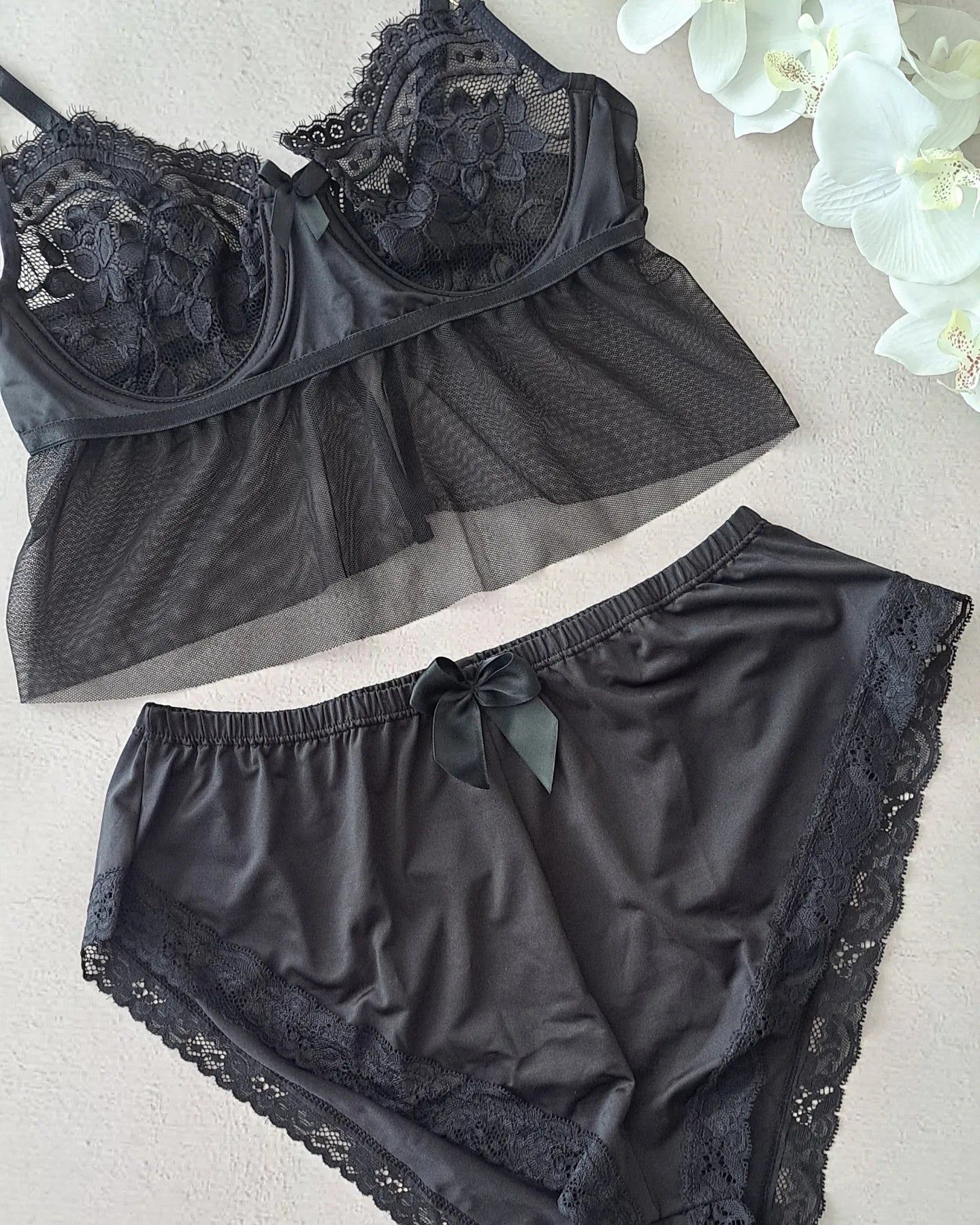 Top elaborado en malla elástica en combinación con encaje, trae varilla y broche en espalda. Con delicado bolero debajo del busto. Short tipo Cachetero con buena amplitud, elaborado en satén suave con terminación en encaje.