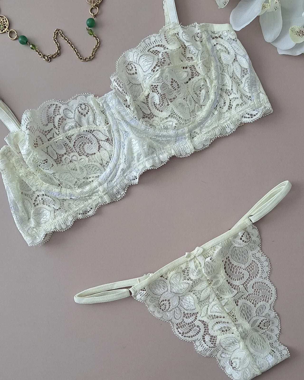 Incluye braguita graduable tipo hilo y brasier con aro de corte media copa, es ideal para chicas de busto mediano a grande. Elaborado en encaje elástico de textura suave. Es un aliado para el uso diario